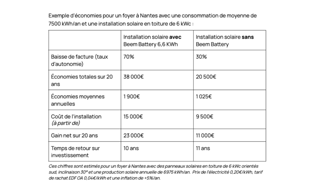 Et côté rentabilité, c’est pas mal non plus. Pour vous donner un ordre d’idées, une installation solaire en toiture de 6 kWc (consommation moyenne de 7500 kWh/an) couplée à une Beem Battery de 6,6 kWh, peut vous permettre d’économiser jusqu’à 38 000 € en 20 ans (contre 20 500 € sans la batterie) :